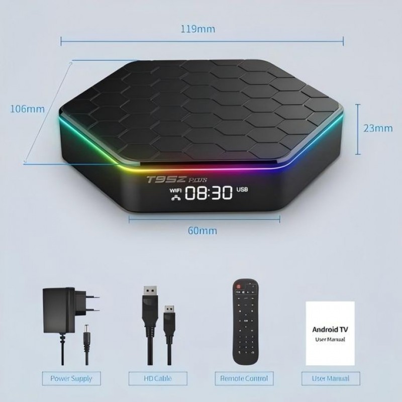 T95Z Plus Smart Android TV Box can change your traditional TV & LCD monitor into a multimedia center by connecting the Internet (Via WiFi or RJ45). This smart Android TV Box will bring you much fun and convenience with its powerful feature: Android 12.0, Allwinner H618 Quad-core A53 CPU, Mali-G31 GPU, 2GB RAM and 16GB ROM, 4GB RAM and 32GB ROM, 4GB RAM and 64GB ROM optional, 6K video hardware decoding, 2.4G & 5G WiFi6, BT5.0 and 100M LAN. Simply plug it into your TV, and you are ready to go!