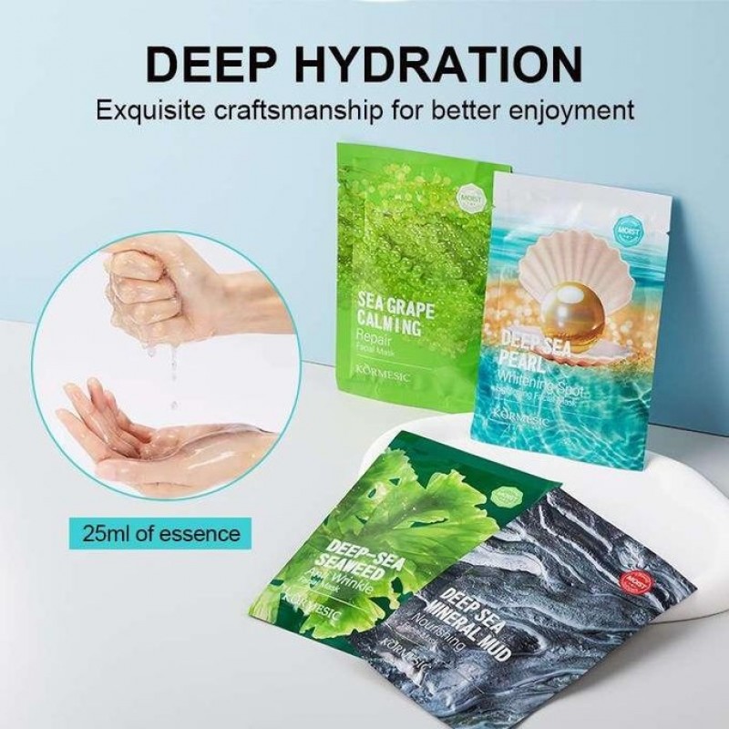 4-in-1 Deep Sea Hydrating, Repairing, Nourishing & Anti-Wrinkle Sheet Mask Combo – With Sea Grape, Pearl Extract, Seaweed & Mineral Mud.