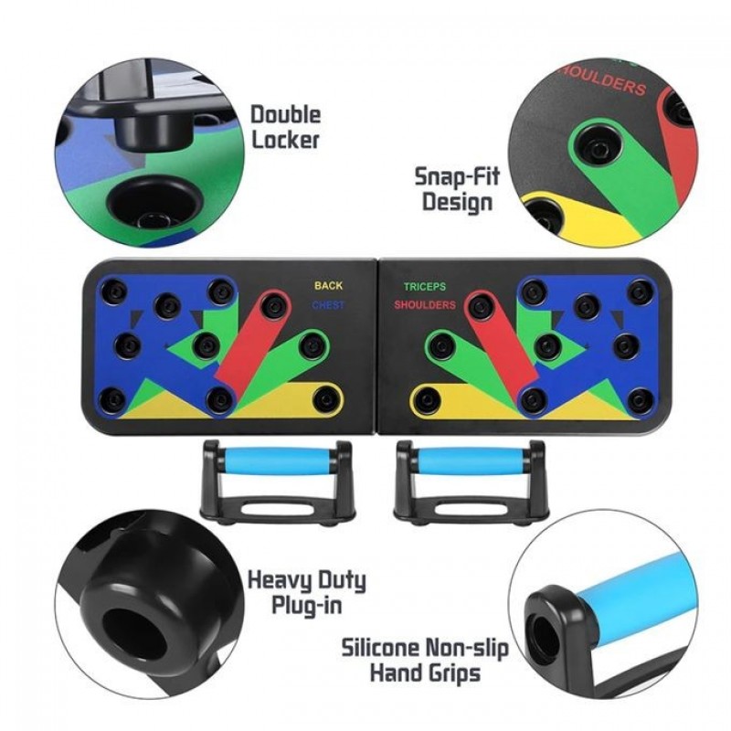 Feature:--Different color-coded push up board targets specifics muscles worked (Blue-chest, Red-shoulders, Yellow-back, and Green-triceps)--Heavy duty "Plug & Press" push up board system with multiple positions and angles that sculpt and maximize upper body definition--Burn calories and build strength with this innovative pushup system, including access to workout videos on the You Tube channel that lead you through a total-body--Portable, Simple Assembly and Storage.--Premium, Cushioned, Non-slip Hand Grips Specification:Material: ABS PlasticMain Color: BlackBoard Thickness: 18mmDimension: 59.5cm*18.3cm*1.8cmApplication: Outdoor, Office, Home, Gym, etc.