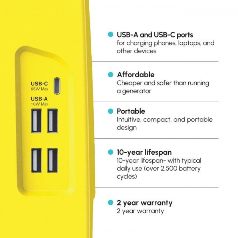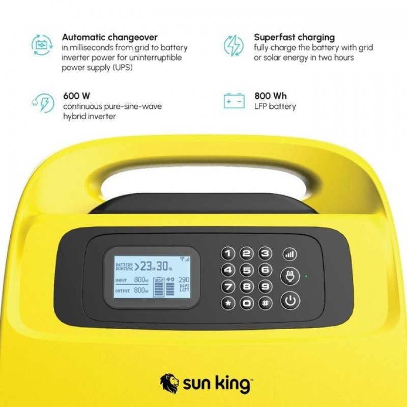 PowerPlay Pro features a broad range of power output options. Its USB-A and USB-C ports power phones and laptops, and its 12-volt-DC ports power Sun King’s own energy-efficient lamps, televisions, and fans. The 600-watt AC socket powers traditional AC appliances, including televisions, speaker systems, high-efficiency refrigerators, desktop computers, printers, point-of-sale (PoS) equipment, and light power tools.